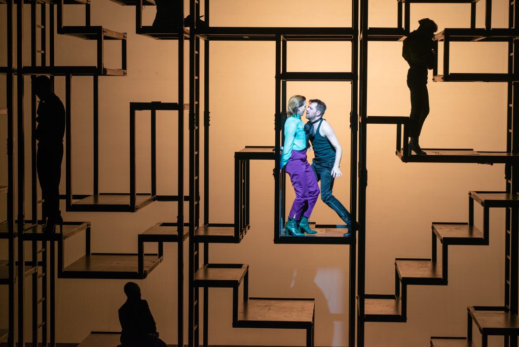 Su un palcoscenico spoglio, abitato da un’impalcatura gigante sulla quale si arrampicano e muovono gli attori, il regista costruisce uno spettacolo dalla forma divertente, elegante, estremamente coinvolgente e lascia emergere una storia profondamente contemporanea di violenza e d’amore.