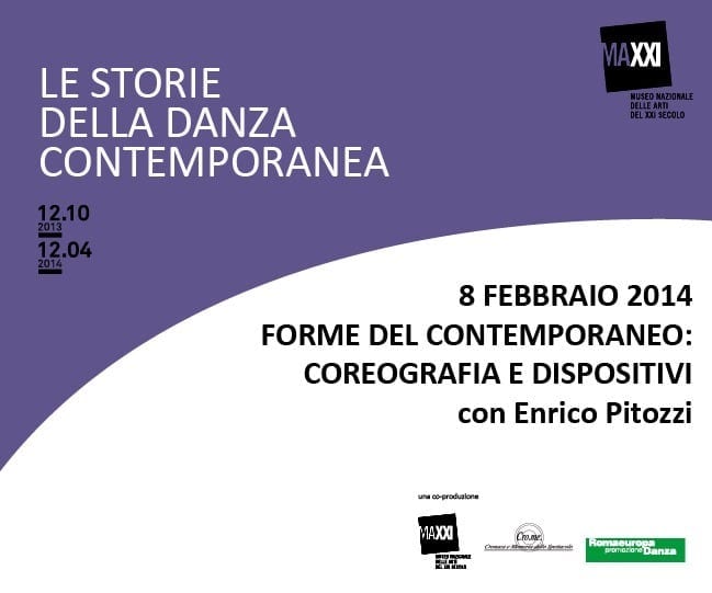 Sabato 8 febbraio 2014 alle ore 11.00 nell’Auditorium del MAXXI si terràl’incontro FORME DEL CONTEMPORANEO: COREOGRAFIA E DISPOSITIVI TECNOLOGICI con Enrico Pitozzi. L’introduzione dei dispositivi tecnologici in scena, dal video alle motion capture, ridefinisce il pensiero del corpo e la composizione del movimento. L’incontro –ripercorrendo le principali esperienze coreografiche in area europea e nord-americana, dalla seconda metàdel Novecento fino ai nostri giorni – rievoca e discute, grazie all’ausilio di materiali audiovisivi dei lavori di Merce Cunningham, N+N Corsino, William Forsythe, Isabelle Choinière, Wayne McGregor, LARTech, le forme e i modi attraverso i quali si èsviluppato l’incontro tra la tecnologia e la danza. Al centro della riflessione le relazioni che i coreografi hanno istituito con le arti visivo-intallative, il suono e l’architettura.