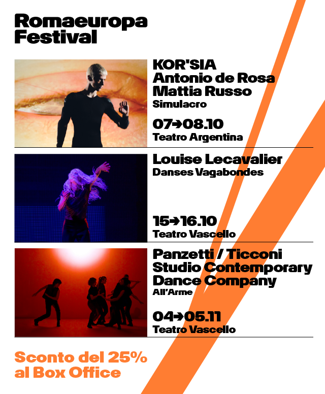 Per usufruire dello sconto del 25%, è possibile: scrivere a promozione@romaeuropa.net , chiamare il nostro box office allo 06.45553050 oppure scriverci su WhatsApp. La promozione è valida per una settimana e fino a esaurimento posti disponibili.