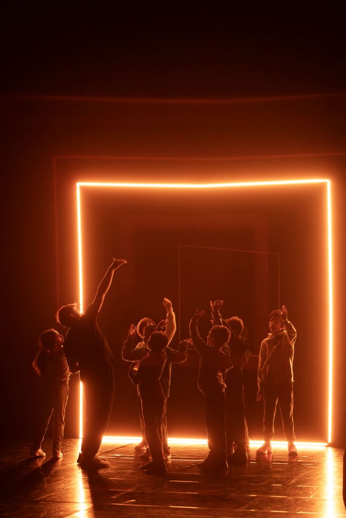 Un gruppo di bambini tra gli 8 e i 10 anni entra in scena senza prove preliminari, guidato da un gesto semplice e naturale: copiare.