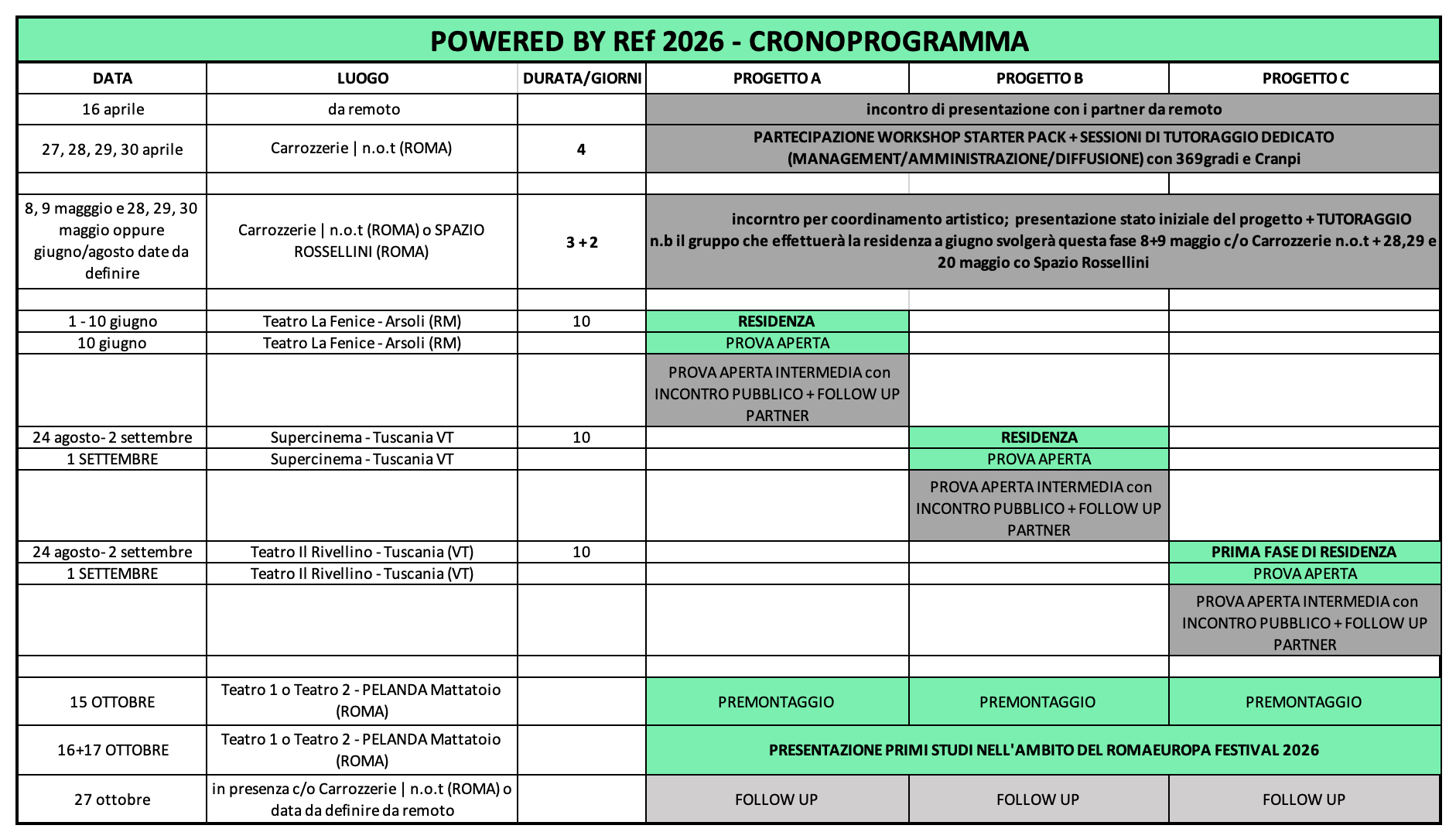 – 2 giorni di studio/incontro con i partner per l’avvio delle azioni di affiancamento artistico da svolgersi presso Carrozzerie | n.o.t o Spazio Rossellini (RM) (maggio/agosto 2026 vd cronoprogramma);